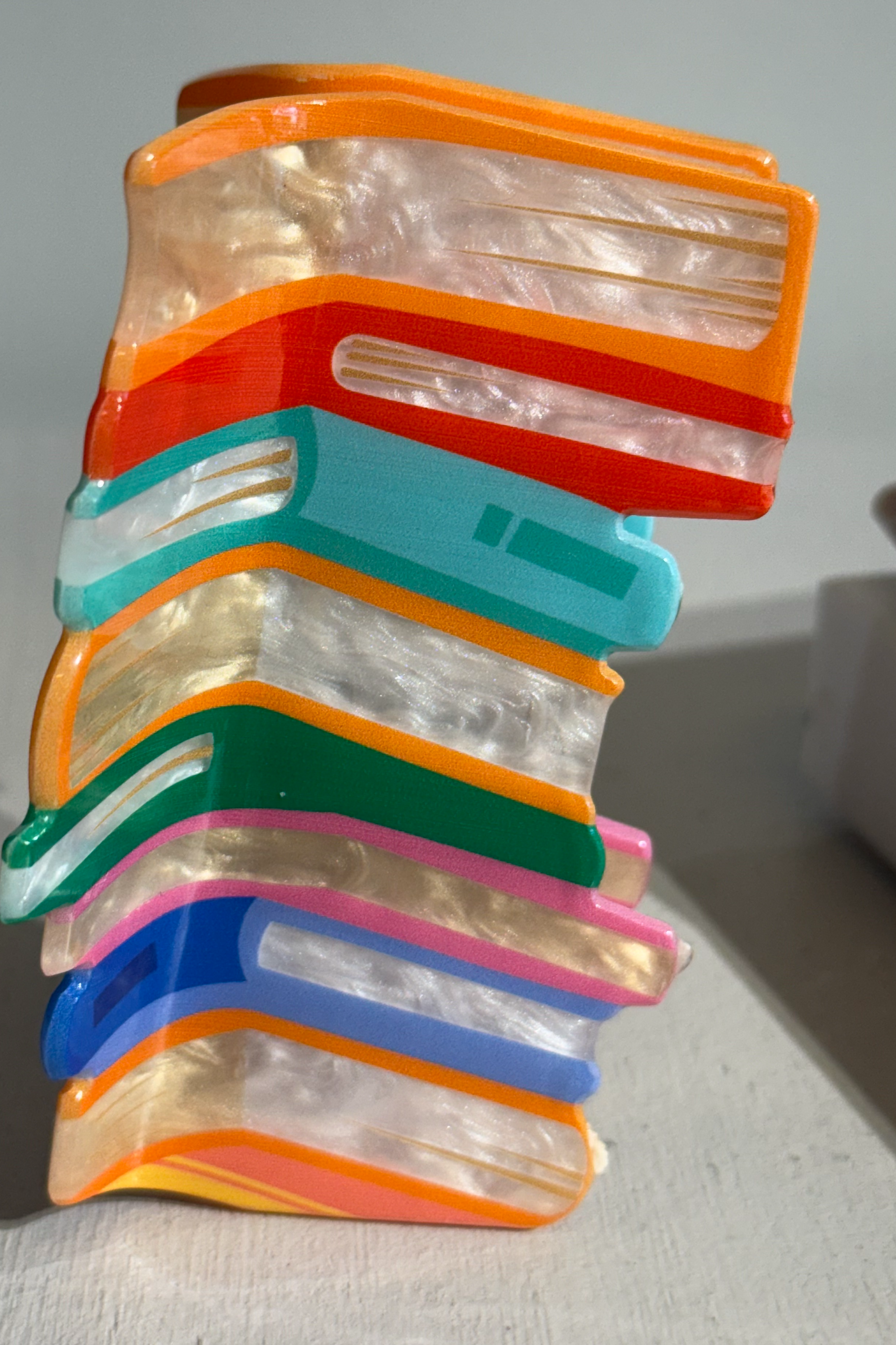 A PLAYFUL AND EYE-CATCHING ACRYLIC HAIR CLIP DESIGNED TO LOOK LIKE A STACK OF COLORFUL BOOKS.